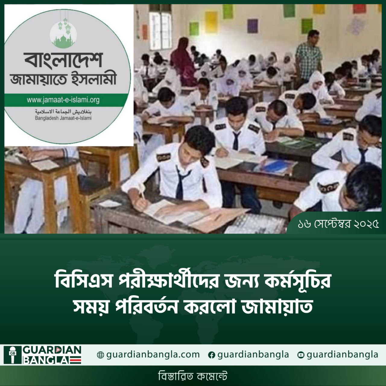 বিজ্ঞপ্তিতে বলা হয়েছে, দেশবাসী ইতোমধ্যেই অবগত হয়েছেন যে, জুলাই জাতীয় সনদের ভিত্তিতে আগামী ফেব্রুয়ারিতে অবাধ, সুষ্ঠু ও গ্রহণযোগ্য নির্বাচন অনুষ্ঠানের লক্ষ্যে ৫-দফা দাবির ভিত্তিতে বাংলাদেশ জামায়াতে ইসলামীর পক্ষ থেকে ১৫ সেপ্টেম্বর সংবাদ সম্মেলনের মাধ্যমে আগামী ১৮, ১৯ ও ২৬ সেপ্টেম্বর তিন দিনের কর্মসূচি ঘোষণা করা হয়েছে। এদিকে জানা গেছে যে, আগামী ১৮ ও ১৯ সেপ্টেম্বর সকালে বিসিএস পরীক্ষা অনুষ্ঠিত হবে।