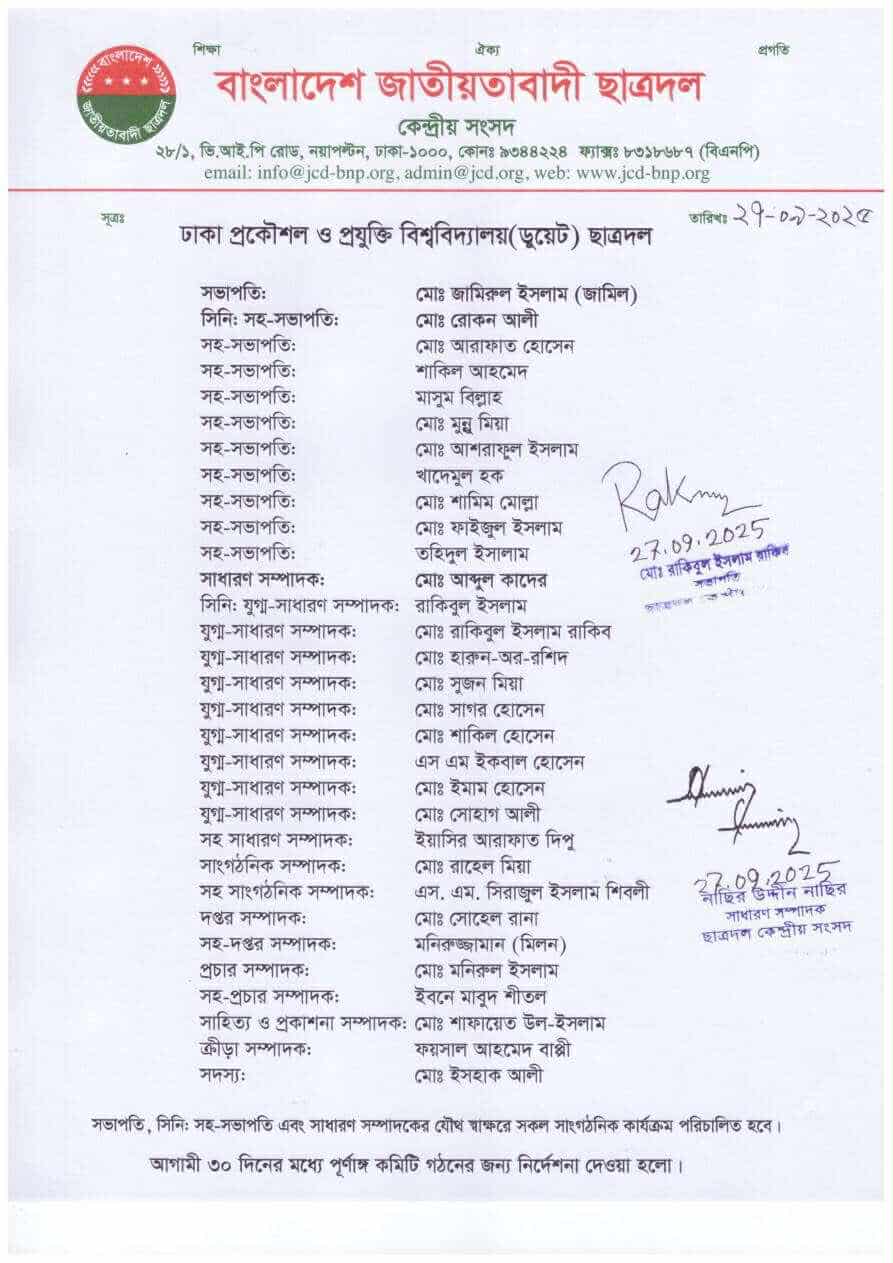 ঢাকা প্রকৌশল ও প্রযুক্তি বিশ্ববিদ্যালয় (ডুয়েট) শাখা ছাত্রদলের সভাপতির পদ পেয়েছেন জামিরুল ইসলাম জামিল ও সাধারণ সম্পাদক পদ পেয়েছেন মো. আব্দুল কাদের।ডুয়েটের কমিটিতে মোট ৩১ জনকে পদ দেওয়া হয়েছে। কমিটিকে আগামী ৩০ দিনের মধ্যে পূর্ণাঙ্গ কমিটি গঠনের নির্দেশ দিয়েছে কেন্দ্রীয় ছাত্রদল।