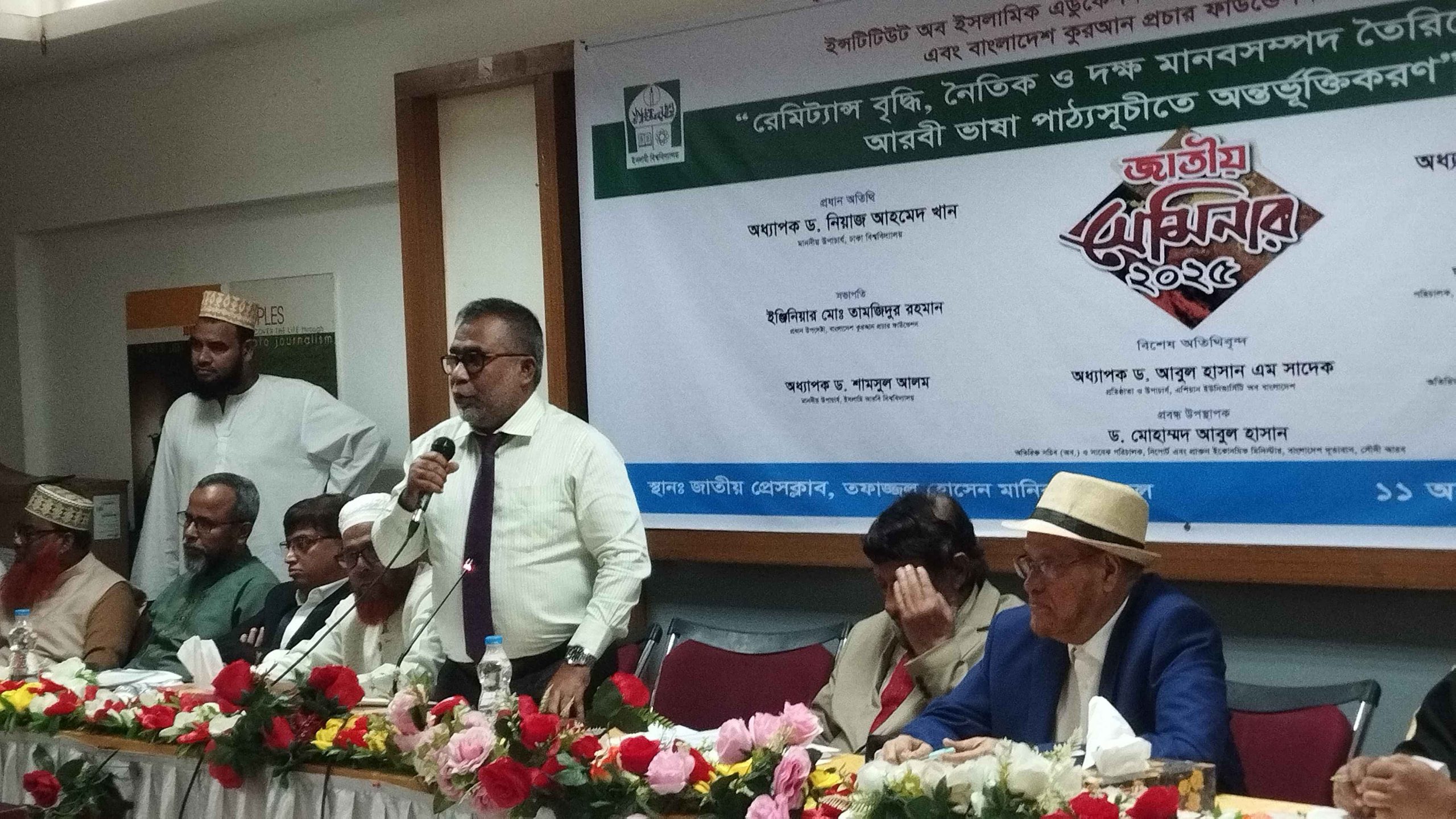 প্রধান আলোচক ইসলামী বিশ্ববিদ্যালয়ের উপাচার্য অধ্যাপক ড. নকীব মোহাম্মদ নসরুল্লাহ বলেন, “আরবি ভাষা শুধু ধর্মীয় নয়, পেশাগত ও অর্থনৈতিকভাবেও গুরুত্বপূর্ণ। যেমন পোশাক শিল্পে বিদেশি বায়ারদের সঙ্গে ইংরেজিতে যোগাযোগের প্রয়োজন হয়, তেমনি মধ্যপ্রাচ্যের শ্রমবাজারে আরবি ভাষার দক্ষতা আমাদের প্রতিযোগিতায় এগিয়ে রাখবে। তাই দেশের শিক্ষা ব্যবস্থায় আরবি ভাষাকে বাধ্যতামূলকভাবে চালু করা সময়ের দাবি।”