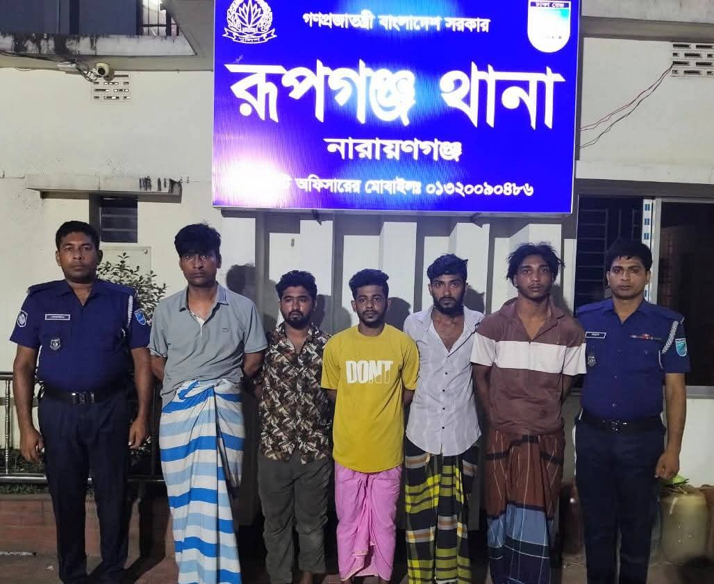 আজ ০৫ সেপ্টেম্বর ২০২৫ (শুক্রবার) রূপগঞ্জ থানার অফিসার ইনচার্জ জনাব মোহাম্মদ তরিকুল ইসলাম, পিপিএম এর নেতৃত্বে এসআই (নিঃ) হুমায়ন কবির, এসআই(নিঃ) সিরাজুল ইসলামসহ সঙ্গীয় ফোর্স সেনাবাহিনীর সাথে গোপন সংবাদের ভিত্তিতে যৌথ অভিযান পরিচালনাকালে রূপগঞ্জ থানাধীন মুড়াপাড়া ইউনিয়নস্থ মাছিমপুর মিরগদাই সাকিনস্থ জনৈক সিরাজুল ইসলাম এর পরিত্যক্ত বিল্ডিং এর ভিতর অভিযান পরিচালনা করে ১। রমজান মোল্লা (৩৫), পিতা- আবদুল মান্নান, সাং- মাছিমপুর, ২। মোঃ সবুজ মিয়া (২৬), পিতা-মৃত আব্দুল মান্নান, সাং-পাড়াগাও, ৩। মেহেদী হাসান (২৫), পিতা-ফারুক মিয়া, সাং- ছোনাব, ৪। এনামুল হক(১৯), পিতা -আজিজুল হক, সাং-ব্রাহ্মনগাও, ৫। সুমন মিয়া (২৪), পিতা- খোকন মিয়া, সাং- ভায়েলা, সকল থানা- রূপগঞ্জ, জেলা- নারায়ণগঞ্জদের ধৃত করে। এসময় তাদের দখল থেকে ১। বিদেশি পিস্তল ১ টি, ২। ম্যাগাজিন ২ টি, ৩। এ্যামোনিশন ১০ রাউন্ড, ৪। ফেনসিডিল ৬ বোতল, ৫। ইয়াবা ৯ পিস, ৬। ককটেল ১৪ টি, ৭। দেশীয় অস্ত্র ৬ টি, ৮। গাঁজা ১২.৫ গ্রাম, ৯। নগদ ১৮,৩৭০/- টাকা উদ্ধারপূবর্ক জব্দ করা হয়। গ্রেফতারকৃতদের বিরুদ্ধে অস্ত্র আইন, বিস্ফোরক উপাদানাবলী আইন এবং মাদকদ্রব্য নিয়ন্ত্রণ আইনে মামলা রুজু করা রয়েছে।
