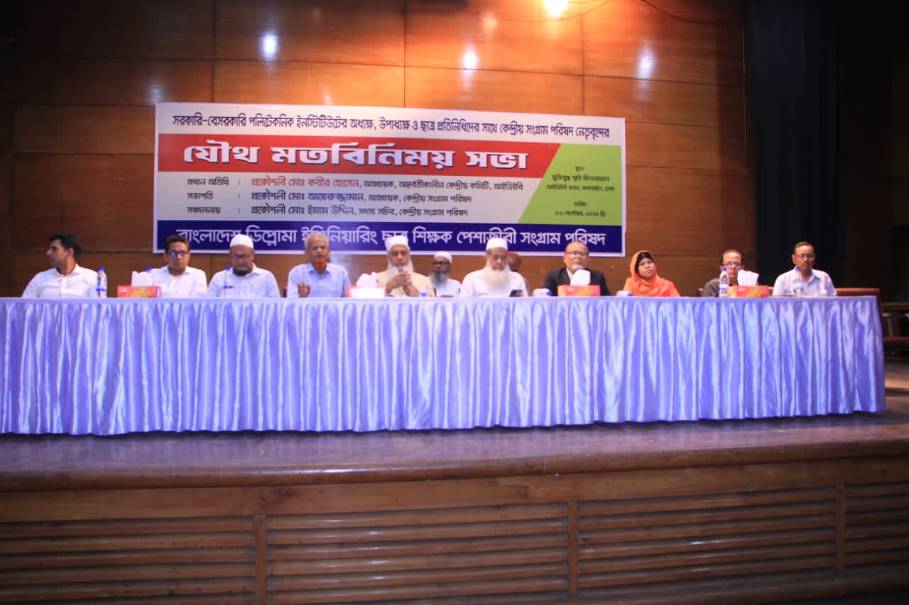 আজ ৬ সেপ্টেম্বর ২৫, শনিবার ঢাকার কাকরাইলে আইডিইবি ভবনে বাংলাদেশ ডিপ্লোমা ইঞ্জিনিয়ারিং ছাত্র শিক্ষক পেশাজীবী সংগ্রাম পরিষদ আয়োজিত কেন্দ্রীয় সংগ্রাম পরিষদ, সরকারি বেসরকারি পলিটেকনিক ইনস্টিটিউটের অধ্যক্ষ, উপাধ্যক্ষ ও ছাত্র প্রতিনিধিদের যৌথ সভায় এসব কথা বলা হয়।