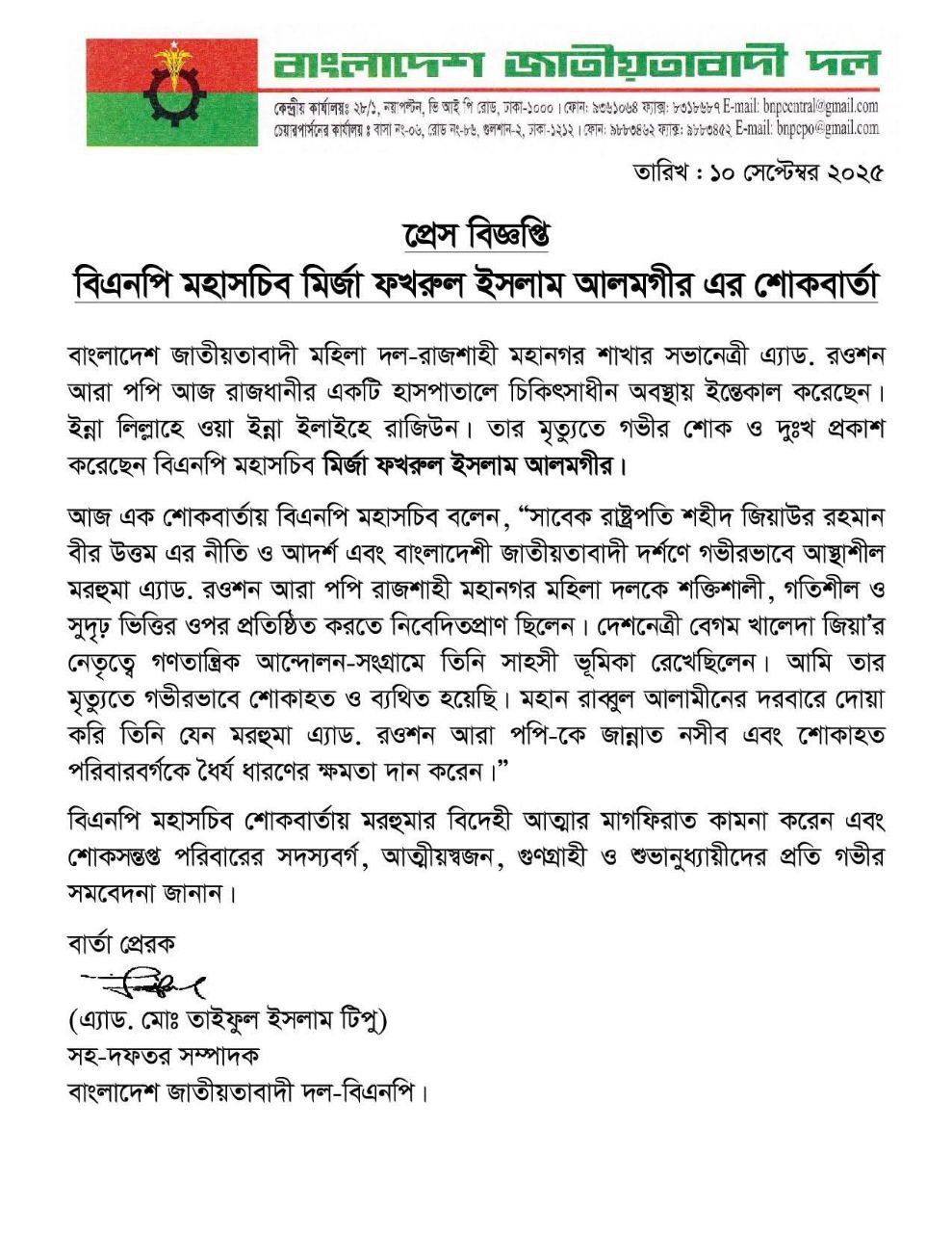 আজ এক শোকবার্তায় বিএনপি মহাসচিব বলেন, “সাবেক রাষ্ট্রপতি শহীদ জিয়াউর রহমান বীর উত্তম এর নীতি ও আদর্শ এবং বাংলাদেশী জাতীয়তাবাদী দর্শণে গভীরভাবে আস্থাশীল মরহুমা এ্যাড. রওশন আরা পপি রাজশাহী মহানগর মহিলা দলকে শক্তিশালী, গতিশীল ও সুদৃঢ় ভিত্তির ওপর প্রতিষ্ঠিত করতে নিবেদিতপ্রাণ ছিলেন। দেশনেত্রী বেগম খালেদা জিয়া’র নেতৃত্বে গণতান্ত্রিক আন্দোলন-সংগ্রামে তিনি সাহসী ভূমিকা রেখেছিলেন। আমি তার মৃত্যুতে গভীরভাবে শোকাহত ও ব্যথিত হয়েছি। মহান রাব্বুল আলামীনের দরবারে দোয়া করি তিনি যেন মরহুমা এ্যাড. রওশন আরা পপি-কে জান্নাত নসীব এবং শোকাহত পরিবারবর্গকে ধৈর্য ধারণের ক্ষমতা দান করেন।”