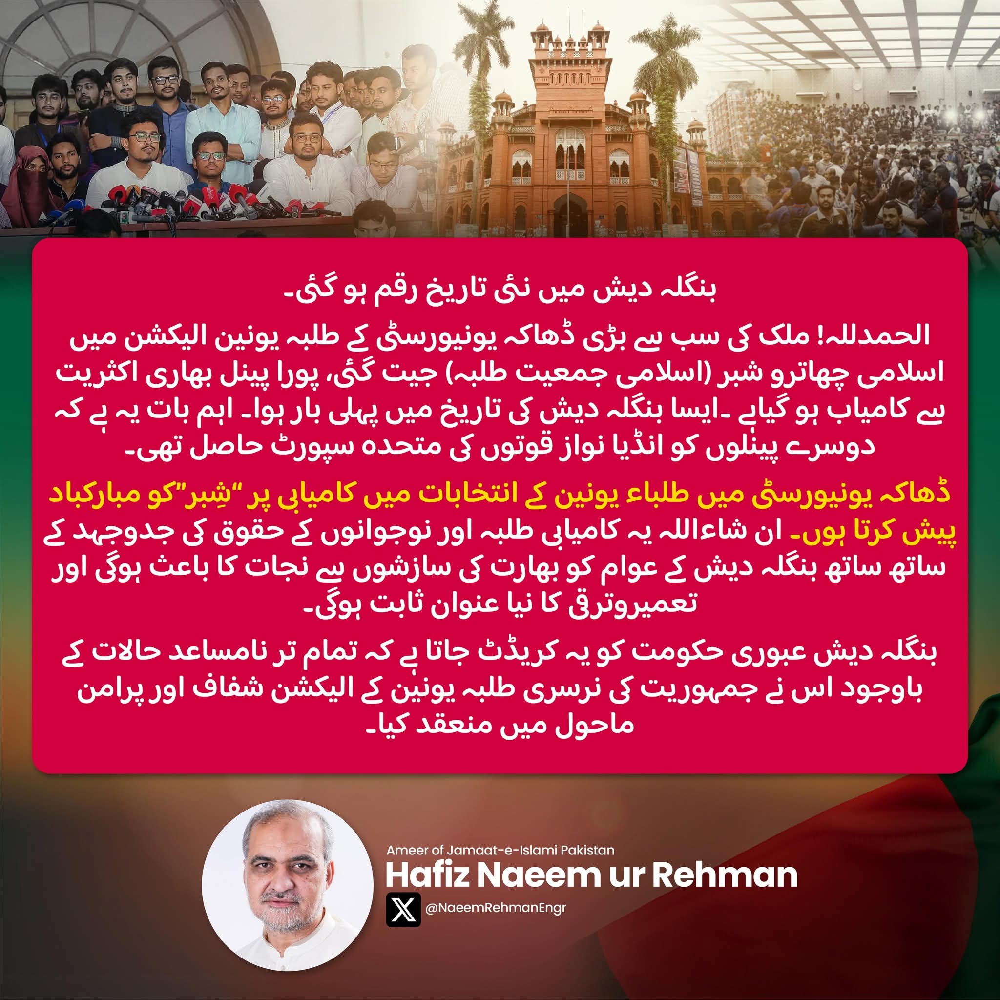 জামায়াতে ইসলামী পাকিস্তান তাদের শুভেচ্ছা বার্তায় অন্তর্বর্তী সরকারকেও কৃতিত্ব দিয়েছে। তারা বলছে, সব প্রতিকূলতা সত্ত্বেও সরকার ছাত্র সংসদ নির্বাচনকে স্বচ্ছ ও শান্তিপূর্ণ পরিবেশে সম্পন্ন করেছে—এটা প্রশংসনীয়।